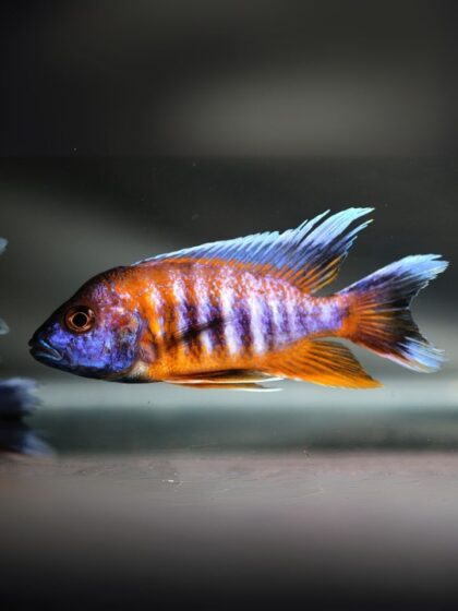 The Taiwan Reef Cichlid is admired for its metallic blue face, yellow dorsal highlights, and shimmering silver-blue body. Native to Lake Malawi, it is peaceful compared to many African cichlids, making it suitable for mixed setups. It thrives in aquariums with sandy bottoms and rocky shelters. Its radiant colors and calm temperament make it a prized choice for hobbyists.